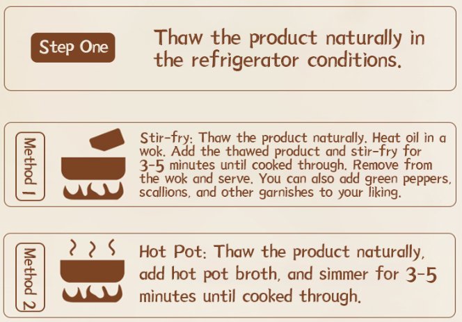 Just thaw and cook direclty.Easy to operate.A good meal can be quickly completed in 5 minutes