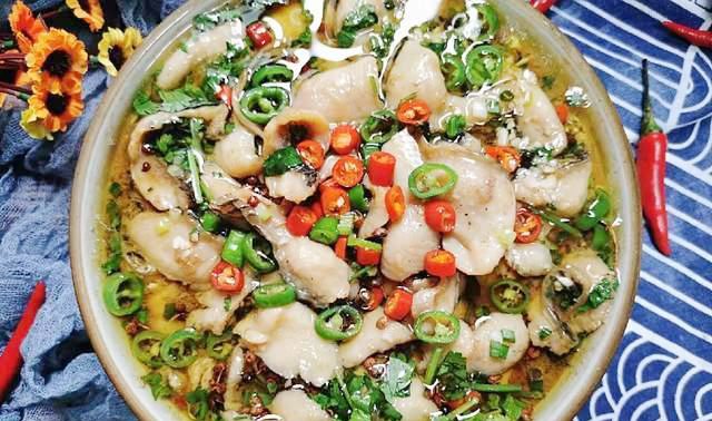 5. Put the marinated fish slices into the soup one by one, stir slowly with chopsticks, cook the fish slices until they float up, then turn off the heat. Pour the soup and fish slices into a bowl, and place the remaining green, red, pepper, Sichuan peppercorns, coriander, and chopped green onions on top of the fish slices;